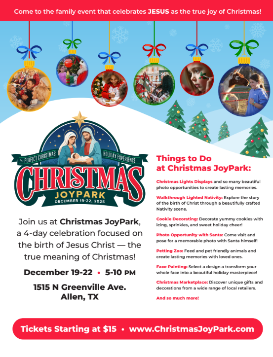 Christmas JoyPark inspires everyone with the true joy of Christmas. We are hosting our fourth annual celebration of the most magical and heartwarming Christmas event in Texas! Hosted in the vibrant city of Allen, Dec. 19-22 on a two-acre field next to the beautiful St. Jude Catholic church campus. The event brings families together to experience the true spirit of Christmas through enchanting attractions like our walkable trail of lights, walkthrough nativity scene, photos and storytime with Santa, crafts, cookie decorating, Christmas caroling and live entertainment, Christmas card decorating, a marketplace, face painting, bounce pads, countless photo-ops and more. This event is designed to create joyful memories, celebrate the birth of Christ and spread the wonder of the season to children and adults alike.