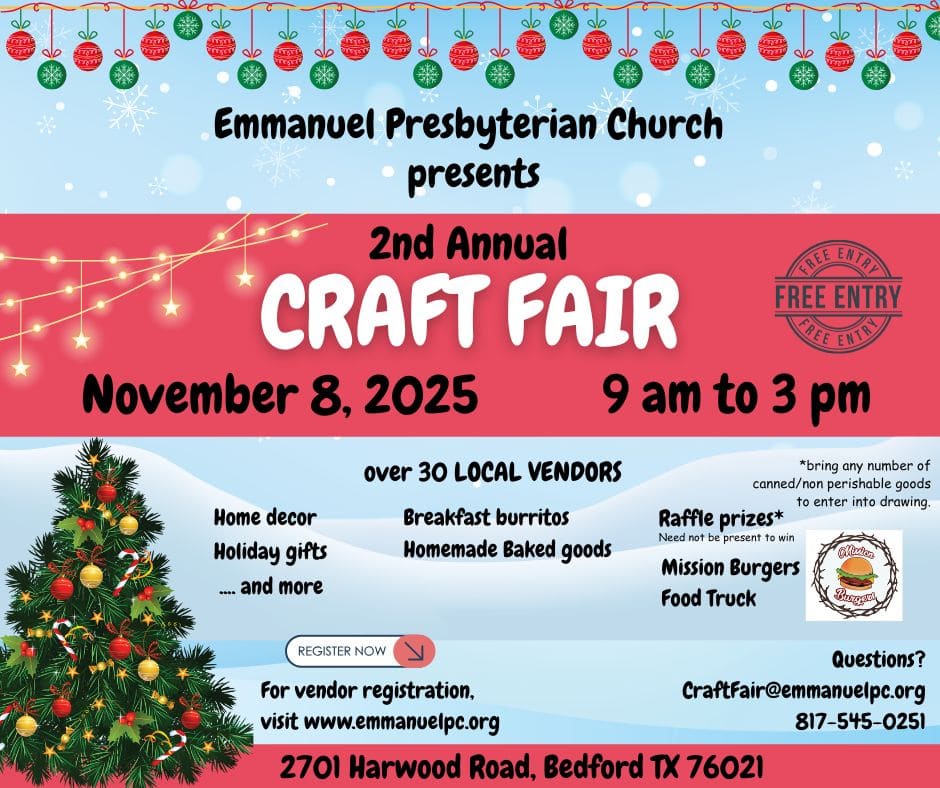 Our 2nd Annual Emmanuel Presbyterian Church Craft Fair is back on Nov. 8, 2025! Last year’s event had a great turnout with many vendors returning, and spaces filled quickly. This year we’ll feature Mission Burgers Food Truck, a bake sale, and raffle prizes. We’re promoting on DFW Craft Fair, Facebook, and Instagram—secure your spot today!
