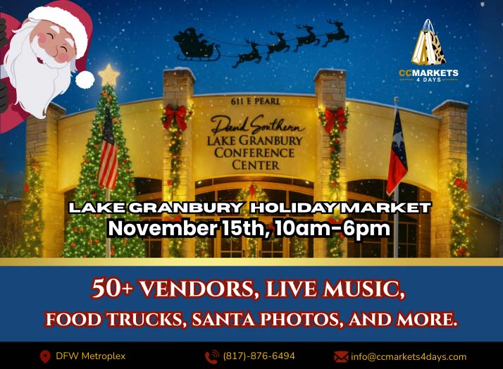 Celebrate the season with a family-friendly day of shopping, community, and holiday cheer at the Lake Granbury Indoor/Outdoor Holiday Market! This festive event brings together incredible local artisans, food trucks, live entertainment, and so much more — all set against the beautiful backdrop of Lake Granbury.